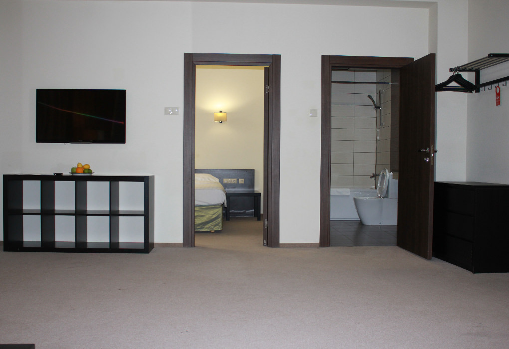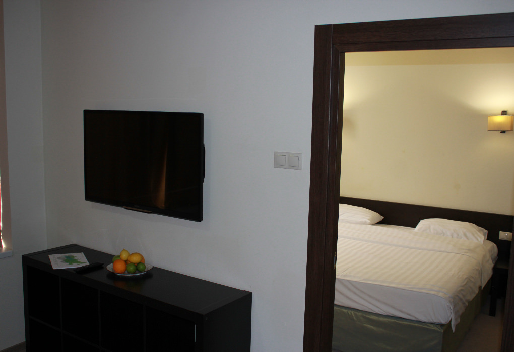 Площадь номера - 48 кв.м. 2 комнаты. 2 осн. места. В номере: телевизор; кондиционер; ванна; туалет; фен; сейф; 2-спальная кровать; чайник. 2 доп. места: Диван - Может быть установлен без ограничения по возрасту.
